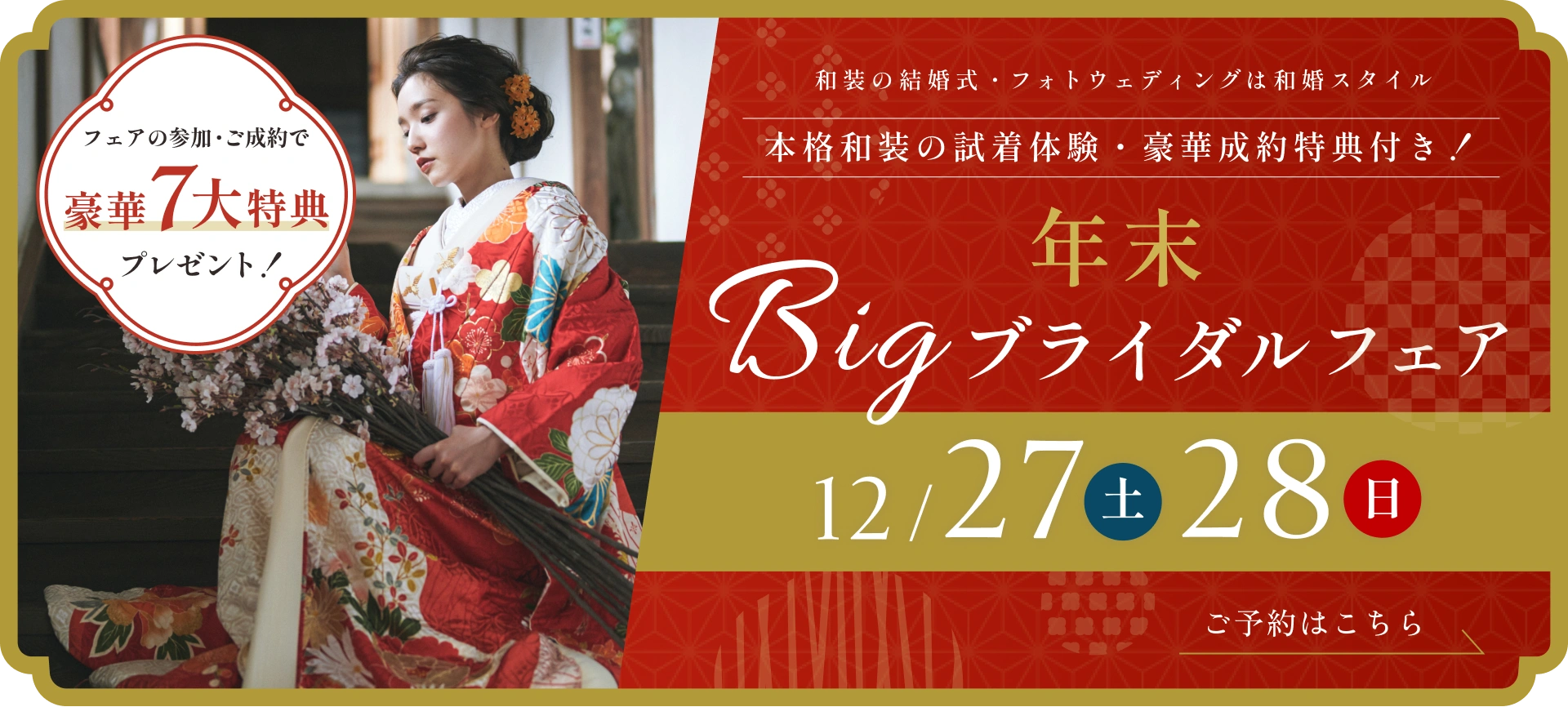 | フェア内容 | 年内最後のスペシャルフェア! 憧れの和装試着体験に、豪華7大成約特典もプレゼント! この機会をお見逃しなく! |