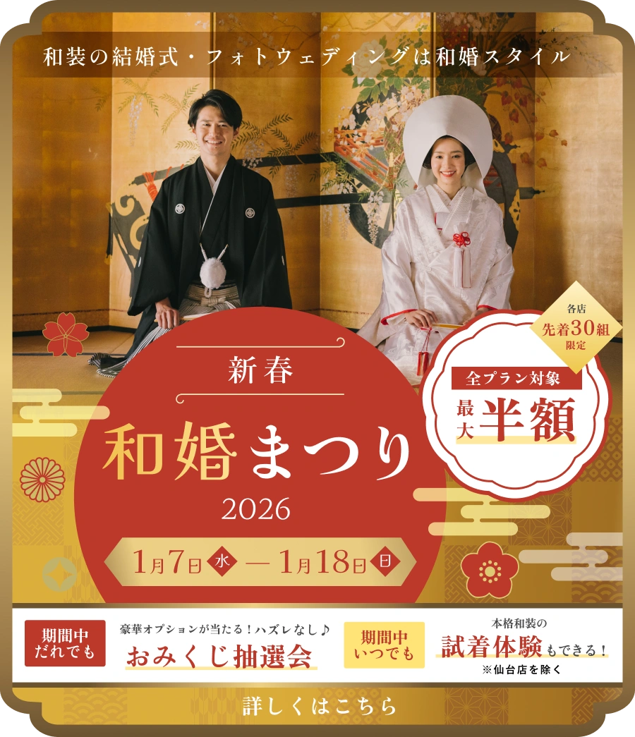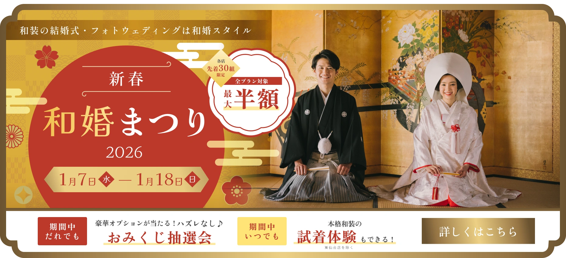 | フェア内容 | 新しい年のスタートを祝して「新春和婚まつり」を開催します。 期間中のご来店・ご成約で、挙式もフォトもすべてのプランがお得に! さらに、楽しみながら和婚を体験できるスペシャルコンテンツをご用意しました。 |