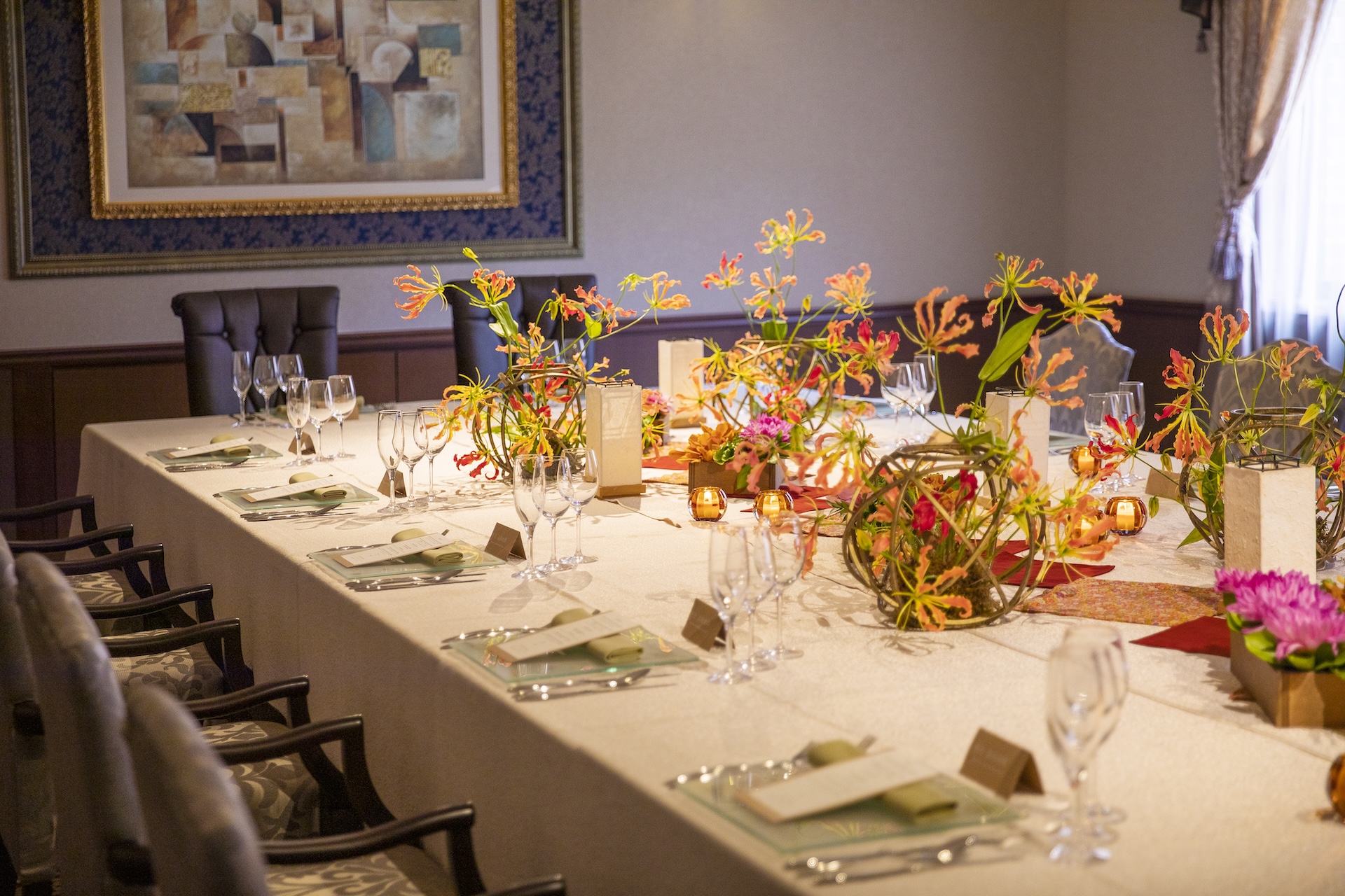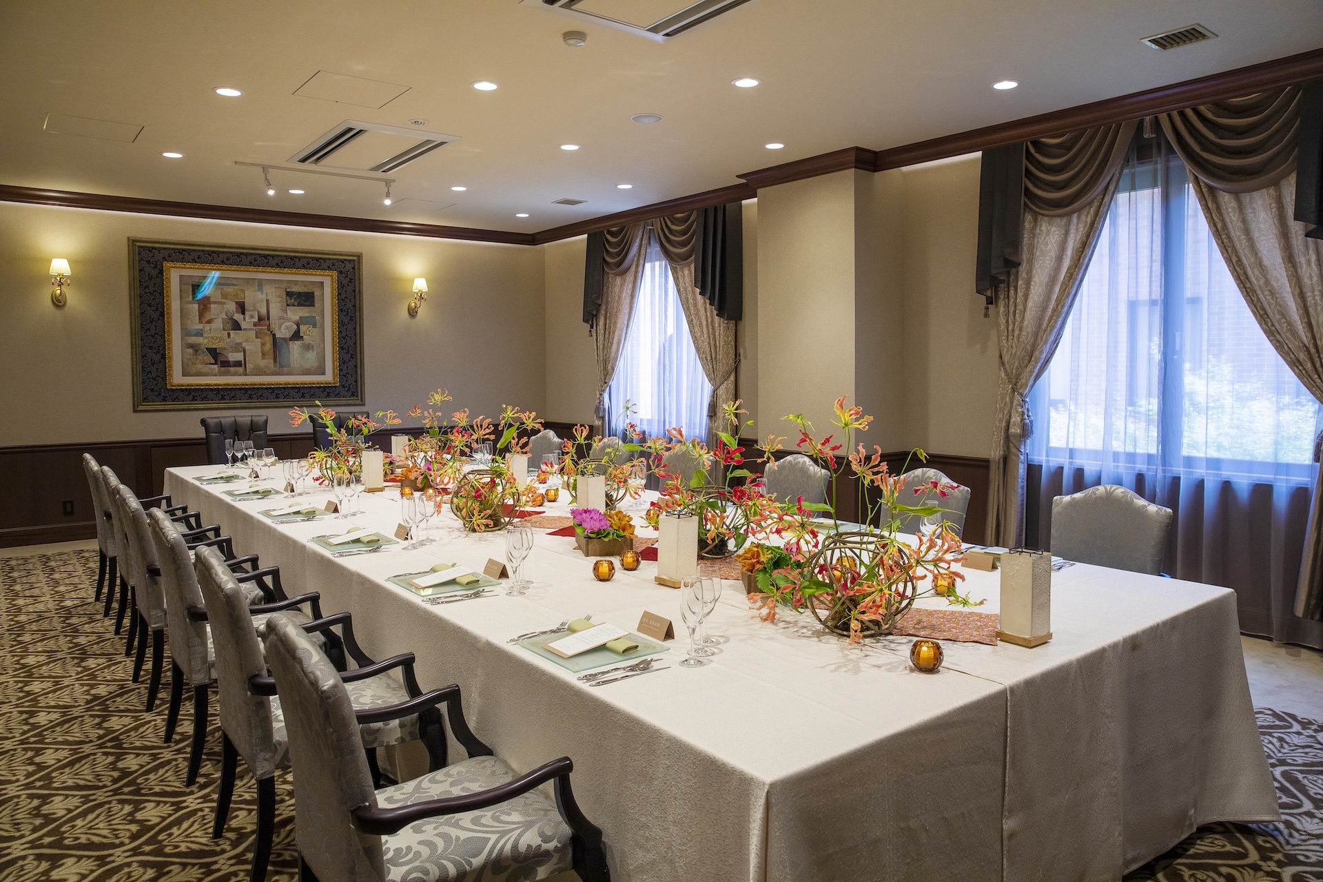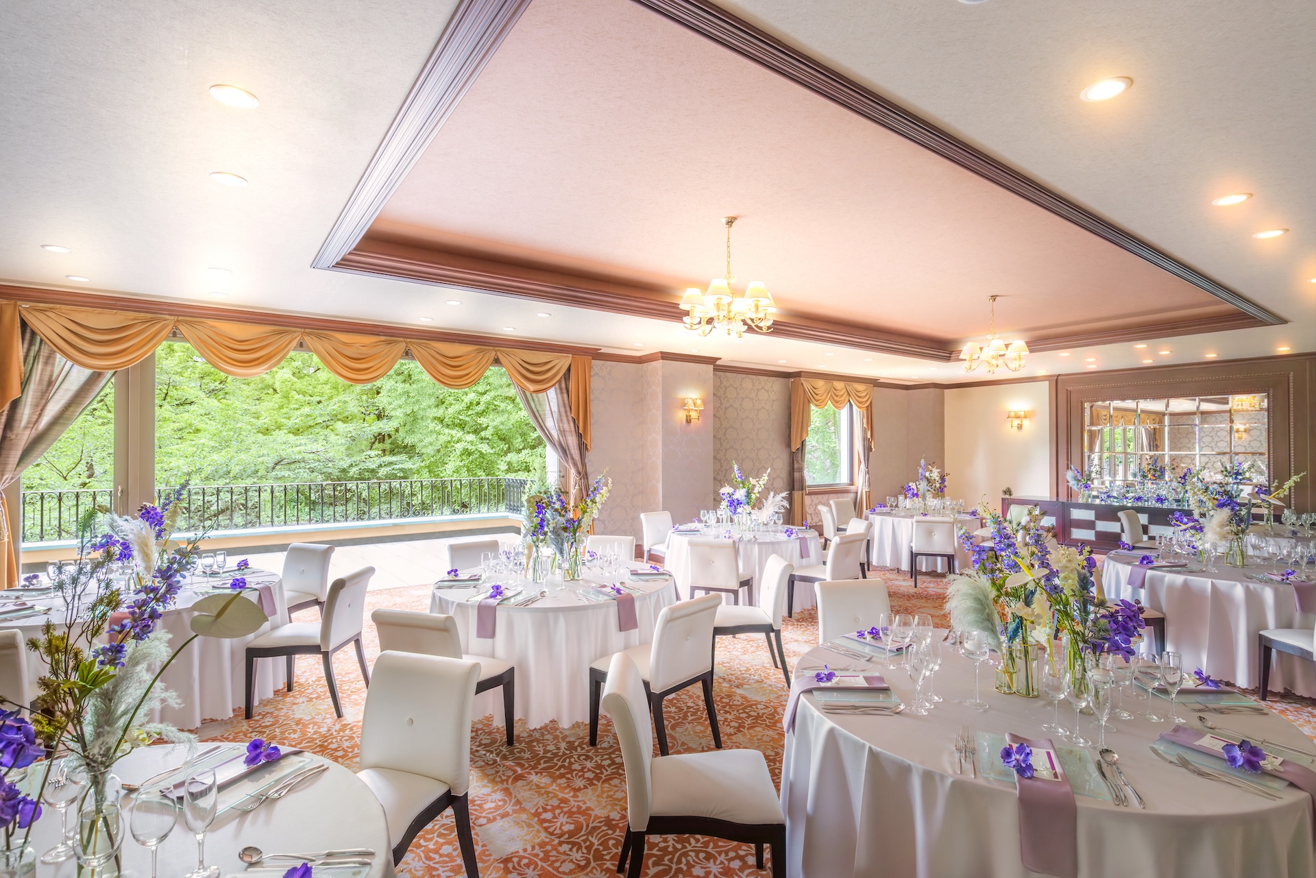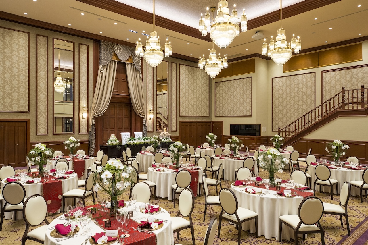 境内にある若宮の杜 迎賓館で、ご親族だけの会食や、来賓友人を招いた大人数のパーティ、やわらかな陽の光が差し込む会場で、移動の負担がなく、ゲストへのおもてなしが叶います。
